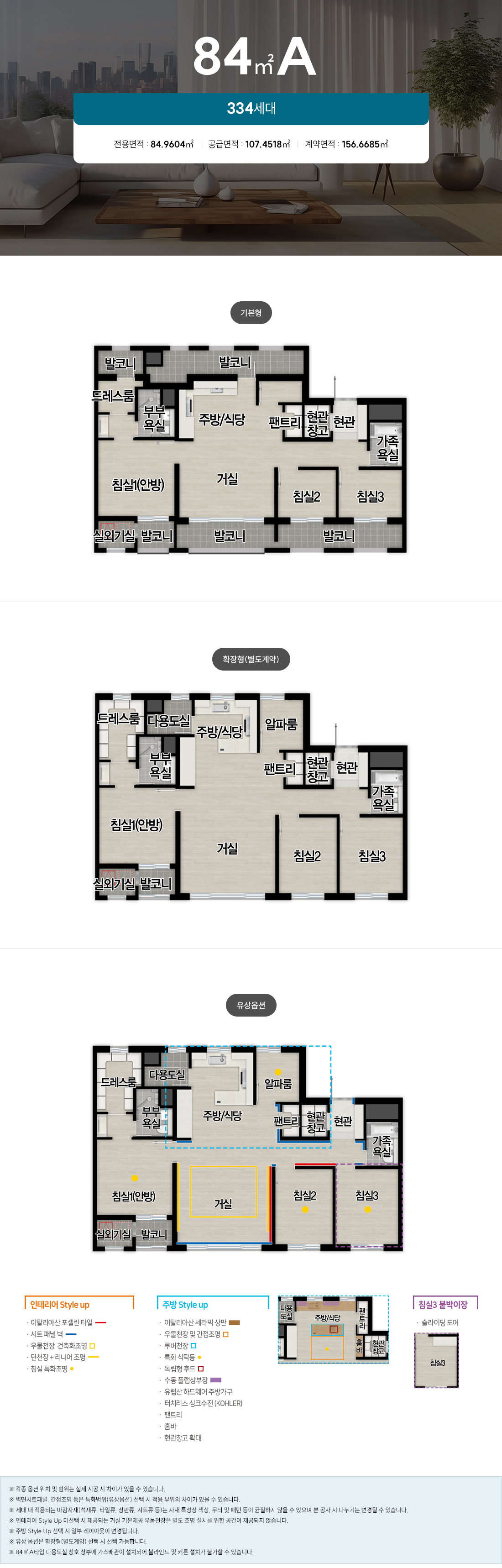 - 84㎡ A/B/C 타입: 실속형 4 Bay 판상형 구조, 팬트리·드레스룸 포함